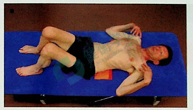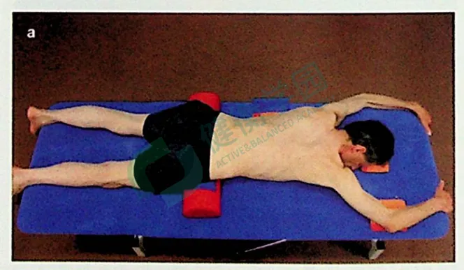 患者的凹侧躺在在一圆枕和矫正垫上。下腿在地上,屈膝向胸;伸展上腿,将其外旋和向后。在地面的手臂呈水平位向前伸;头枕在着地的肩上。如做不到,在头下方垫枕头