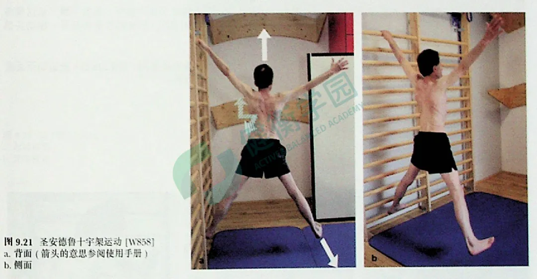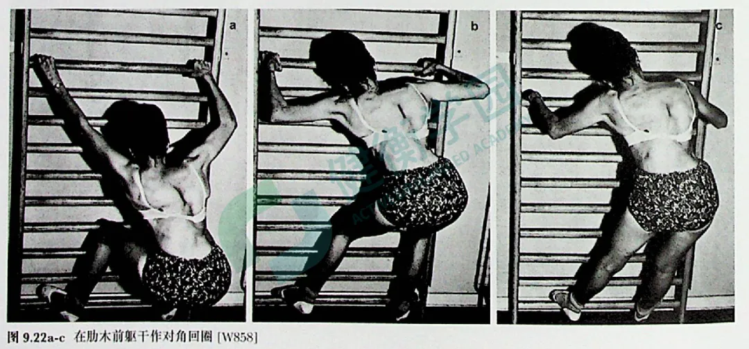 手与肩水平握两杆,与肋木成直角,屈曲双膝(图 9.36a,b)。