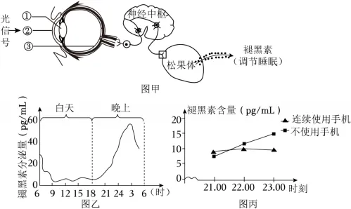 【项目二】资料显示,晚上使用手机会影响睡眠。学习小组想研究晚上使用手机对睡眠的影响是否与褪黑素的分泌有关,设计和完成了相关实验,结果如图丙。