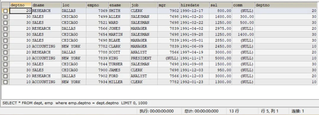 还有一点需要注意,我们的条件中语句的表达方式 WHERE emp.deptno = dept.deptno
