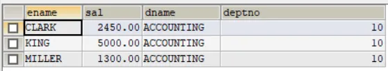 -- 如何显示部门号为 10 的部门名、员工名和工资SELECT ename,sal,dname,emp.deptno FROM dept, empWHERE emp.deptno = dept.deptno AND emp.deptno =10