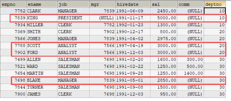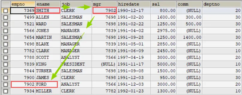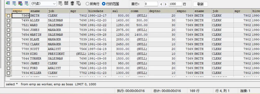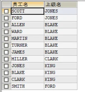 -- 思考题:显示公司员工和他的上级的名字SELECT worker.ename AS '员工名', boss.ename AS '上级名'FROM emp AS worker, emp AS bossWHERE worker.mgr = boss.empno
