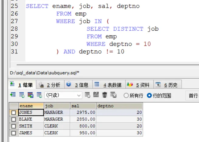 -- 分析1.先得到allen的部门和岗位SELECT deptno, jobFROM empWHERE ename = 'allen'-- 分析2.把上面的查询当成子查询来使用,-- 并且使用多列子查询语法进行匹配SELECT *FROM empWHERE (deptno, job)=(SELECT deptno, jobFROM empWHERE ename = 'allen') AND ename != 'allen'