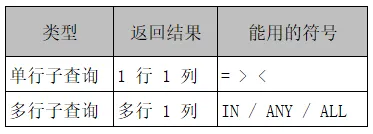 多行子查询,就是子查询会返回「多行、但只有一列」的结果,相当于得到一个值列表,主查询不能用 => 直接比较,必须搭配 IN / ANY / ALL 来使用。
