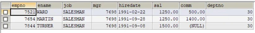 -- 方法二,使用min,就是和其中最小的那个进行比较SELECT ename,sal,deptnoFROM empWHERE sal> (SELECT min(sal)FROM empWHERE deptno = 30)