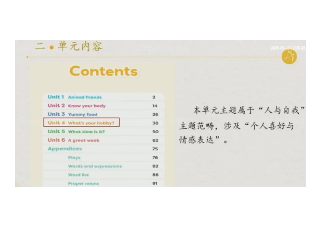 本单元是本册书Unit 4,整册书依次安排了 Unit 1 Animal friends、Unit 2 Know your body、Unit 3 Yummy food、Unit 4 What's your hobby?、Unit 5 What time is it?、Unit 6 A great week 六大主题单元。本单元主题属于 \\“人与自我”\\主题范畴,核心聚焦 \\“个人喜好与情感表达”\\,围绕“What's your hobby?” 展开完整的语言学习与主题探究。