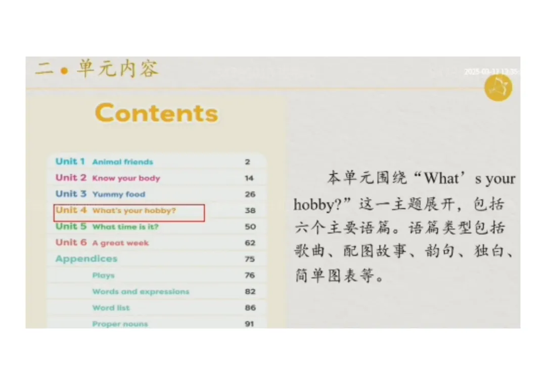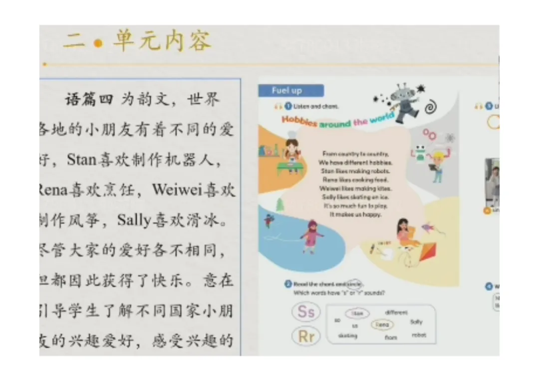 本单元包含六个主要语篇,语篇类型丰富,涵盖歌曲、配图故事、韵句、独白、简单图表、复习整合类内容,层层递进推进教学:
