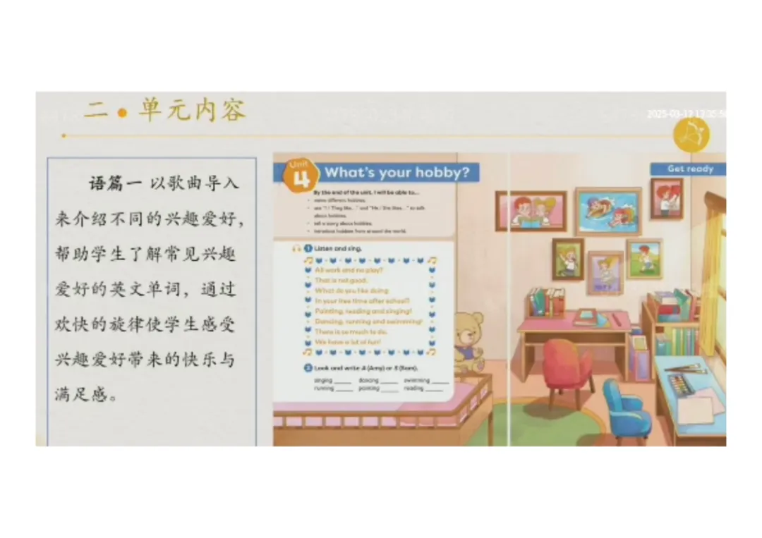 1.语篇一(歌曲):以欢快歌曲导入,呈现常见兴趣爱好词汇,让学生感受爱好带来的快乐;