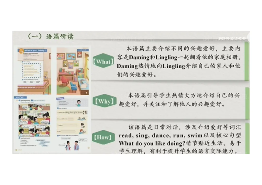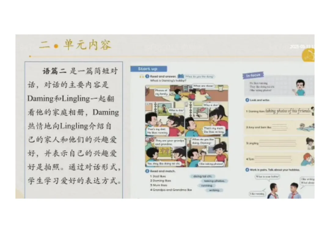 2.语篇二(对话):Daming 和 Lingling 翻看家庭相册,介绍家人及自己的爱好,核心学习爱好表达句型;