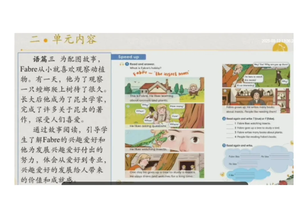 3.语篇三(配图故事):讲述法布尔从小观察动植物,长大后成为昆虫学家的故事,体会爱好成就自我的价值;