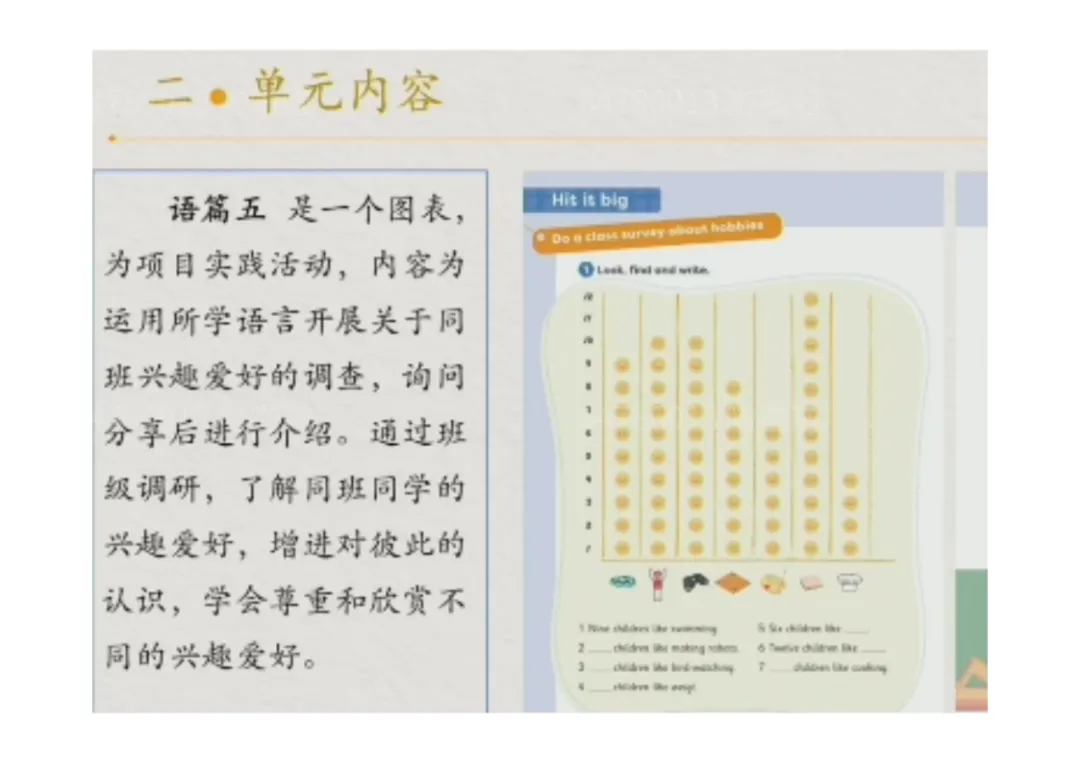 5.语篇五(图表):班级兴趣爱好调查项目实践,学会收集、分享同学爱好信息;