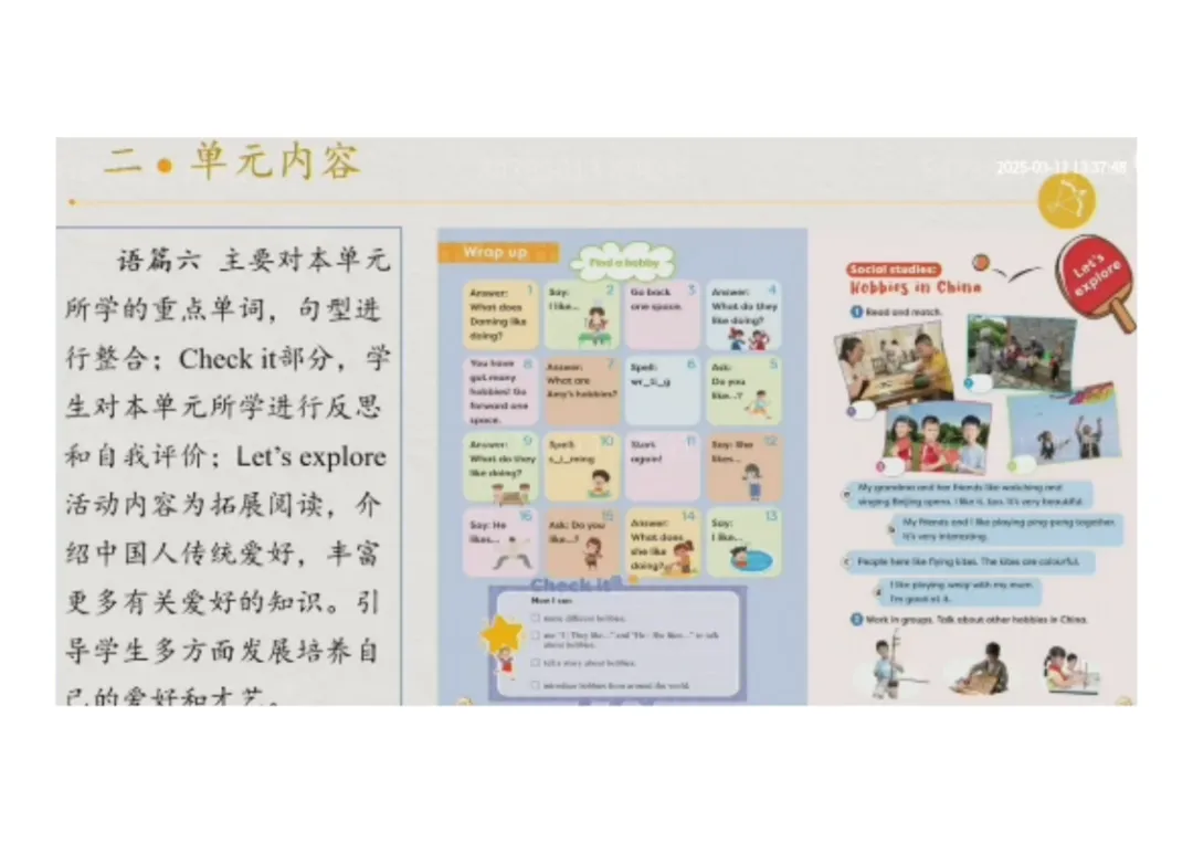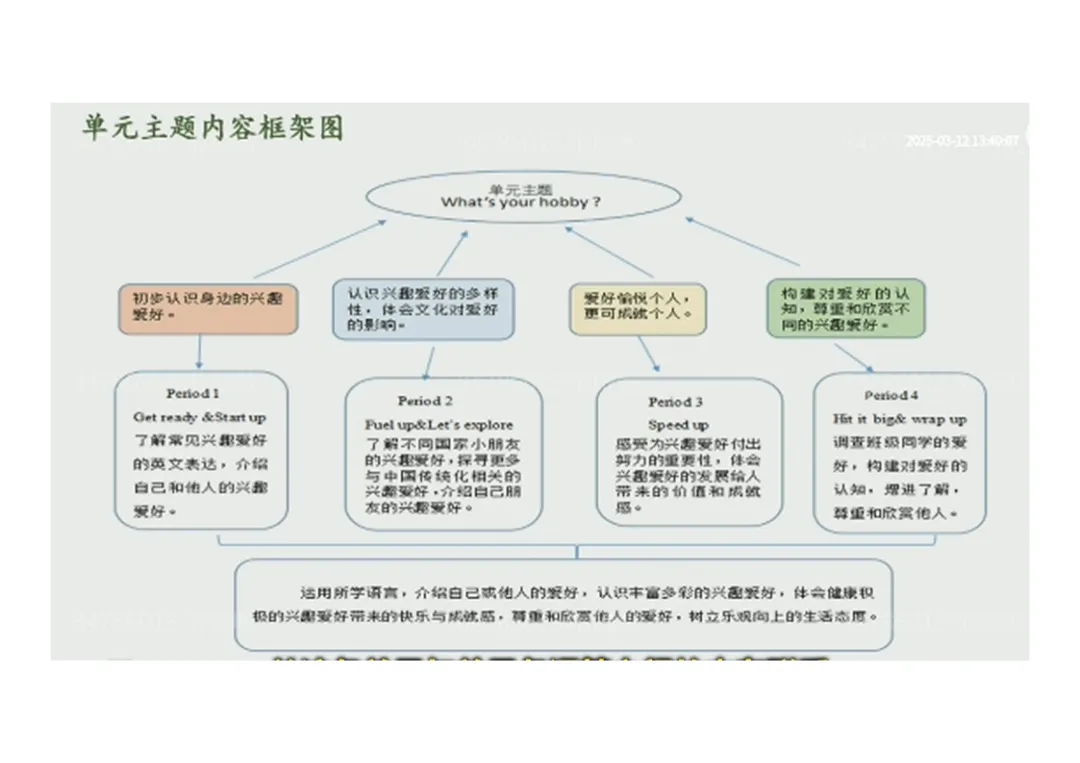4.Period 4:调查分享不同爱好,学会尊重与欣赏他人爱好。单元核心项目:制作爱好翻翻书(Hobby lapbook),分为“我们身边的爱好”“世界的爱好”“爱好名人故事”“我想坚持的爱好” 四部分。