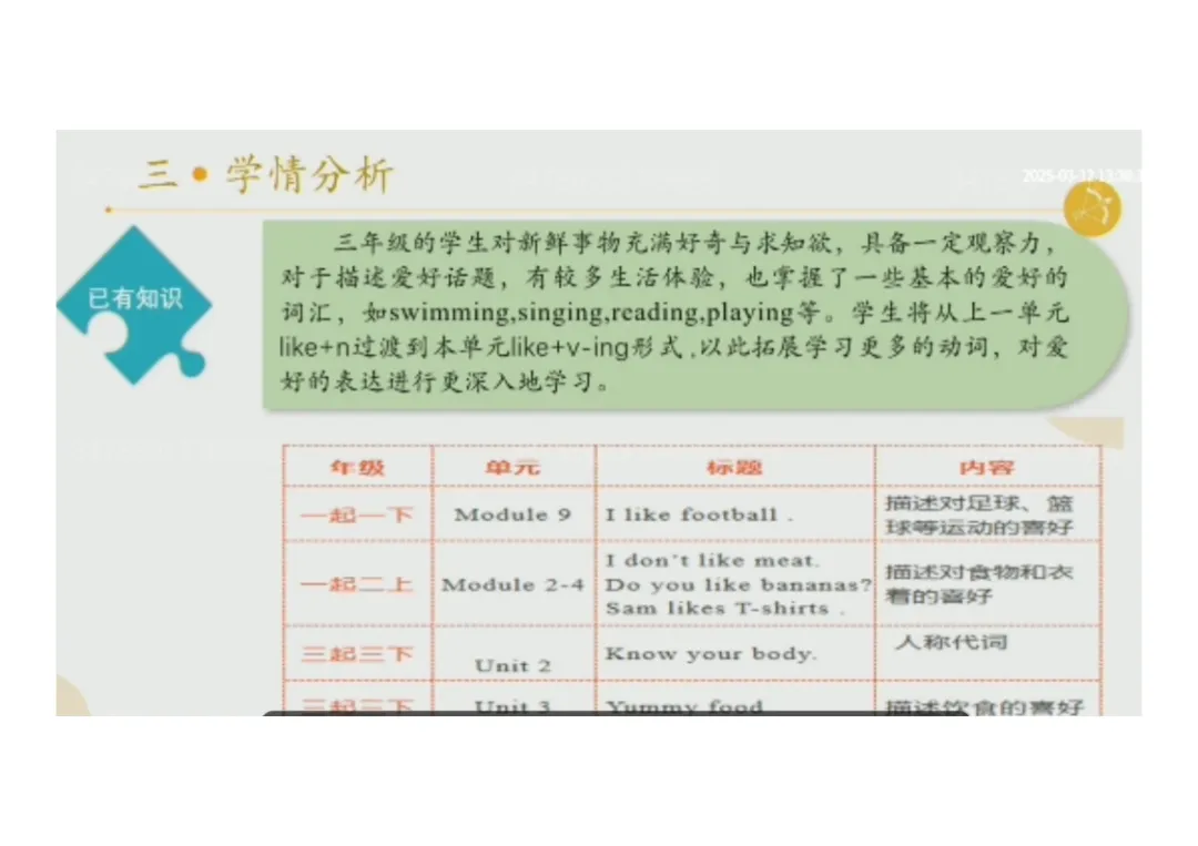 4.前期储备:已学习人称代词、简单喜好表达句型,能支撑本单元学习。