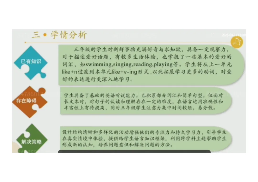 2.已掌握 swimming、singing、reading、playing 等基础爱好词汇;