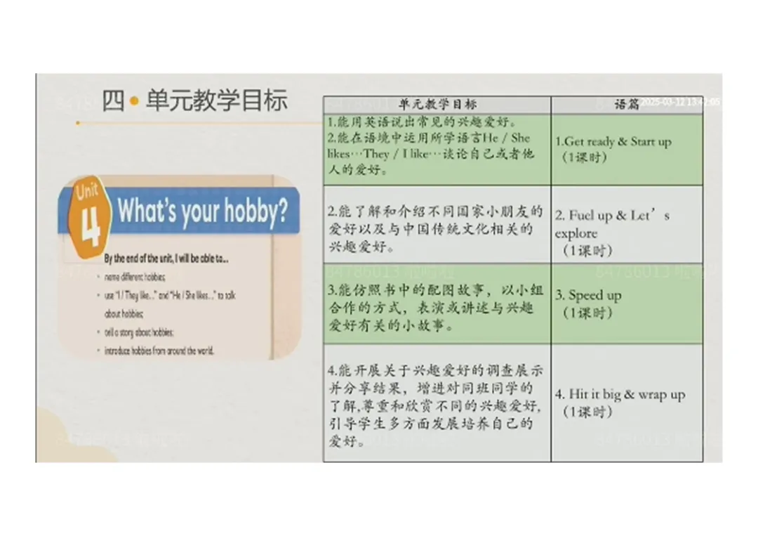 4.Period 4:能完成班级爱好调查并展示结果,尊重、欣赏不同爱好,主动培养自身爱好。