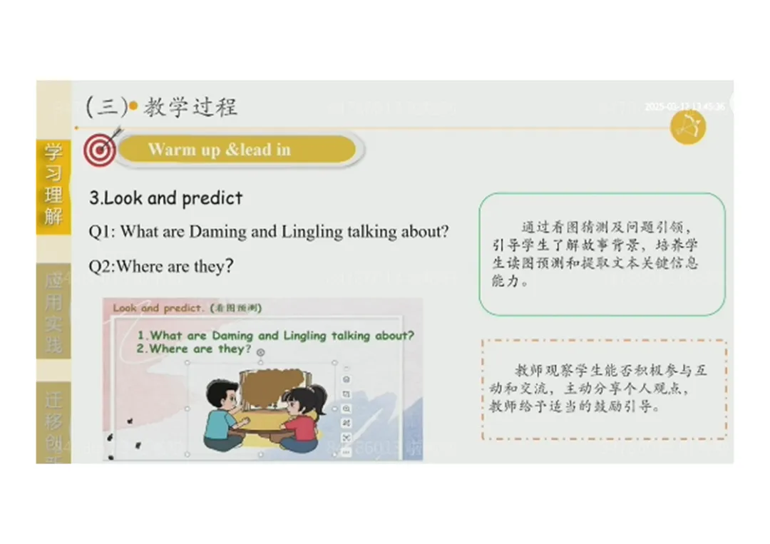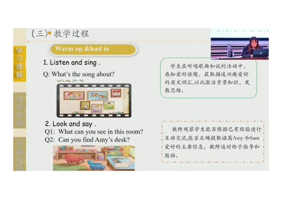 1.Warm up & lead in:听唱主题歌曲感知话题→看图观察房间场景→看图预测对话内容,培养读图能力;