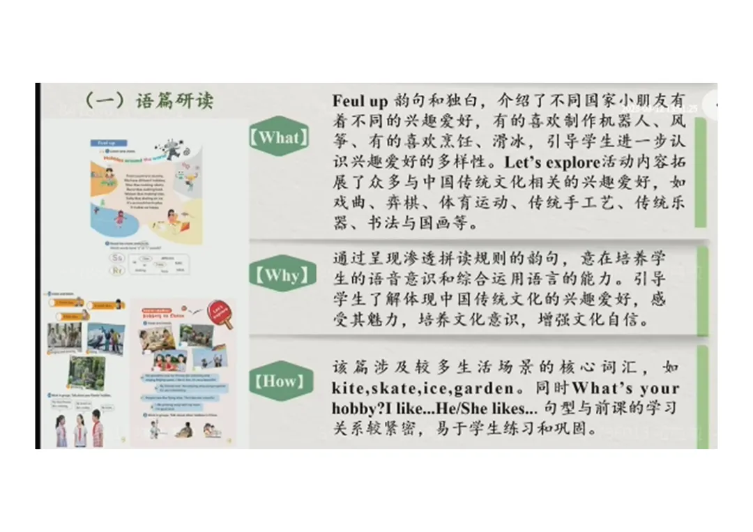 1.What:韵句介绍各国小朋友爱好(制作机器人、烹饪、放风筝、滑冰),拓展中国传统爱好(戏曲、弈棋、传统手工艺、书法、国画等);