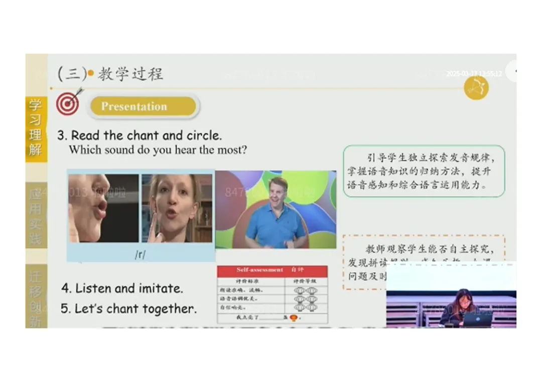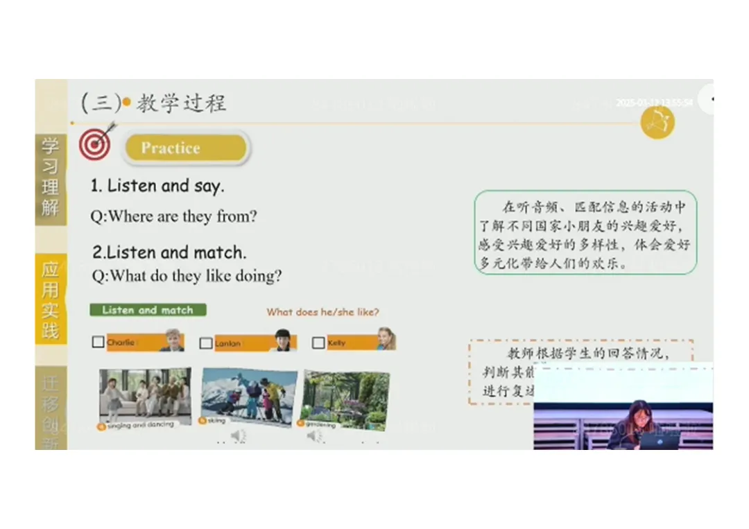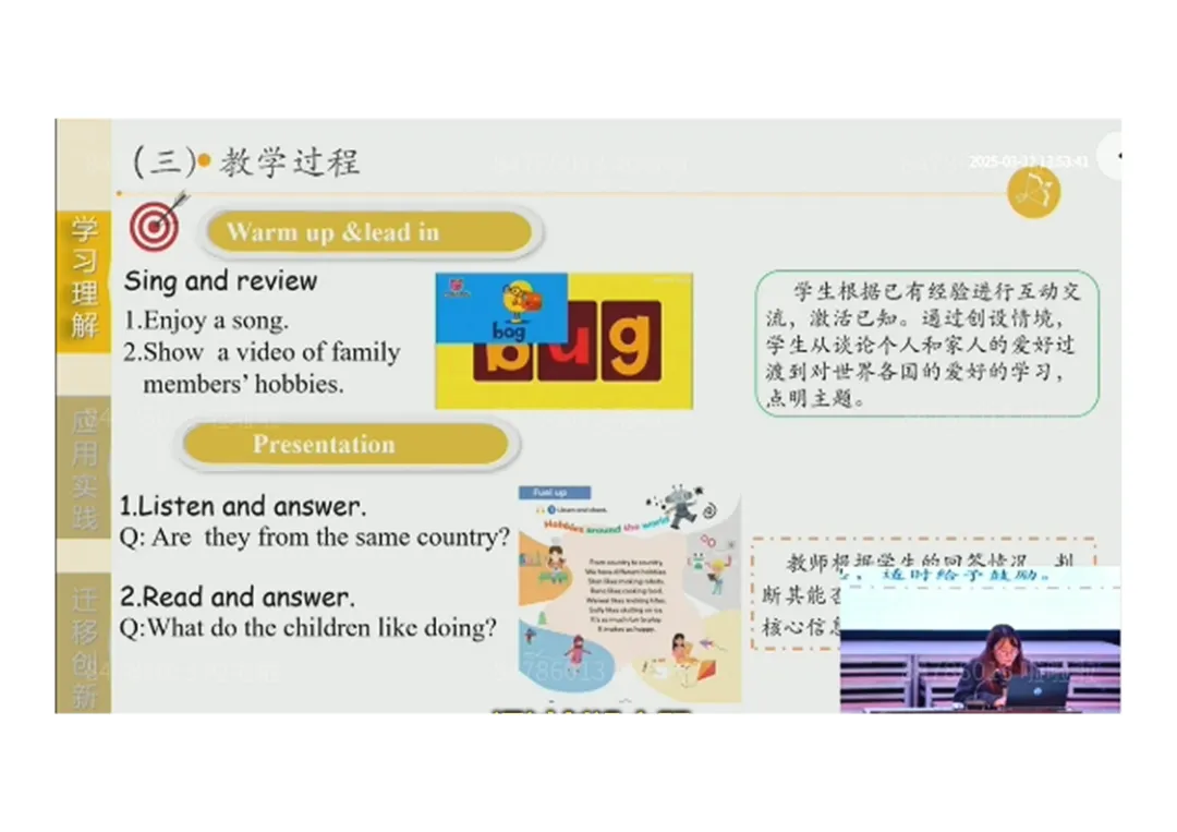 2.Presentation:听音回答国家差异→阅读提取爱好信息→圈画发音、模仿吟唱;