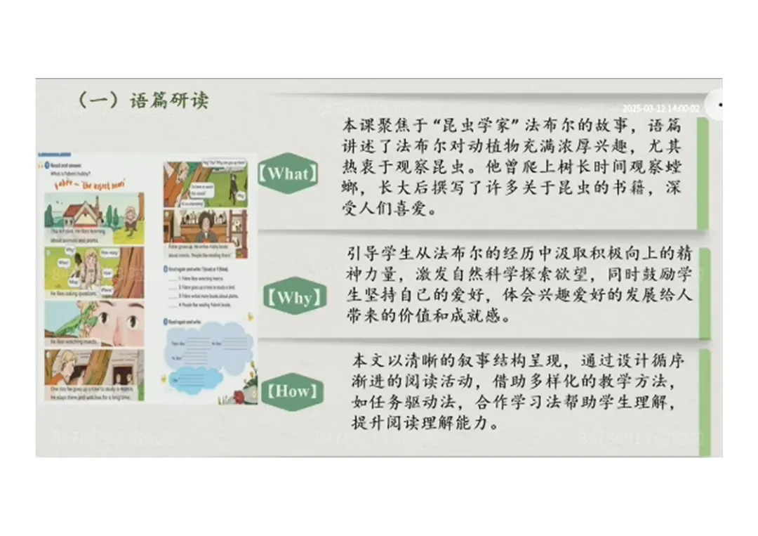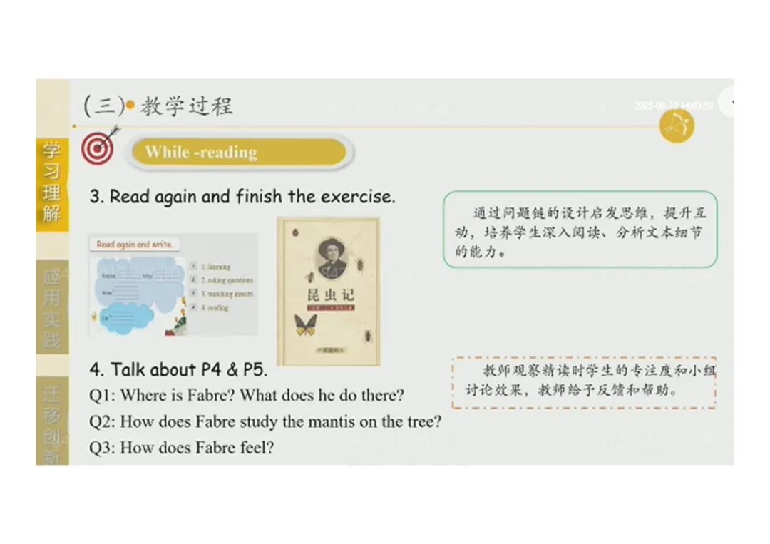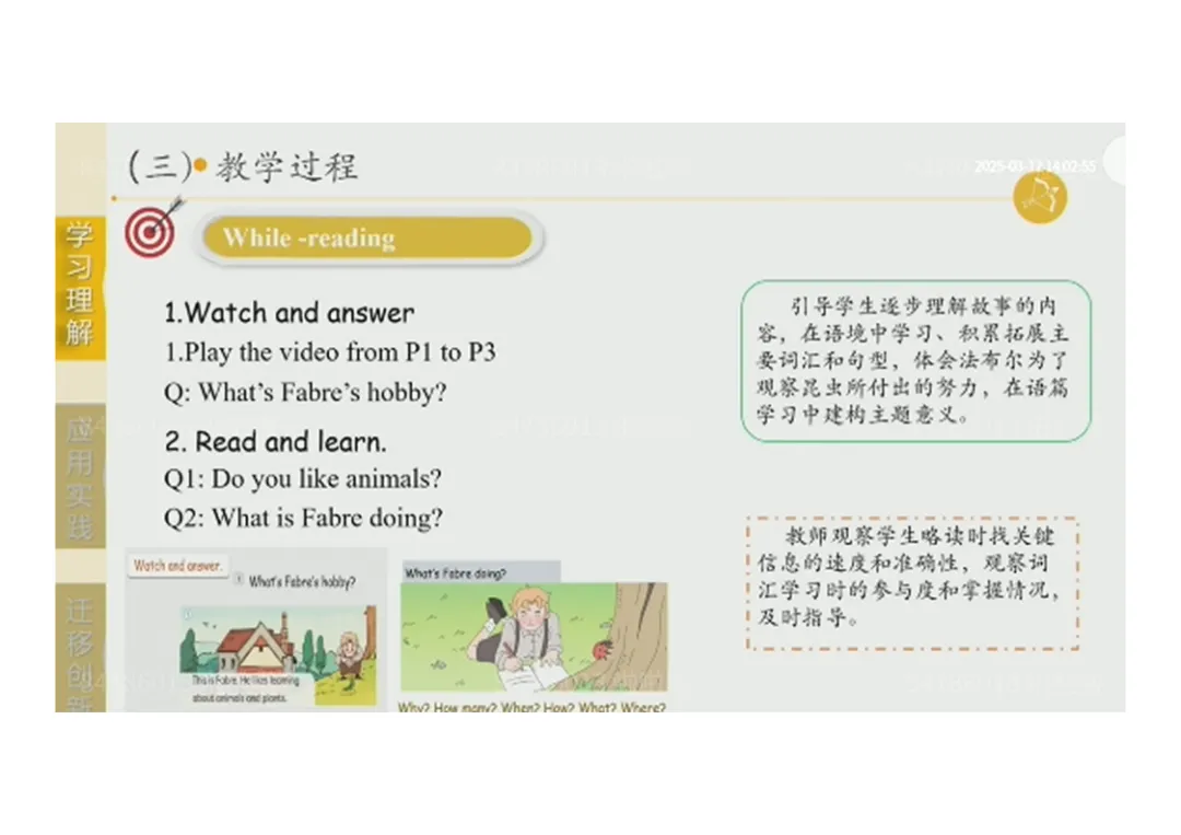 2.While-reading:观看视频回答法布尔爱好→精读学习故事细节→完成阅读练习→深度探讨故事内容;