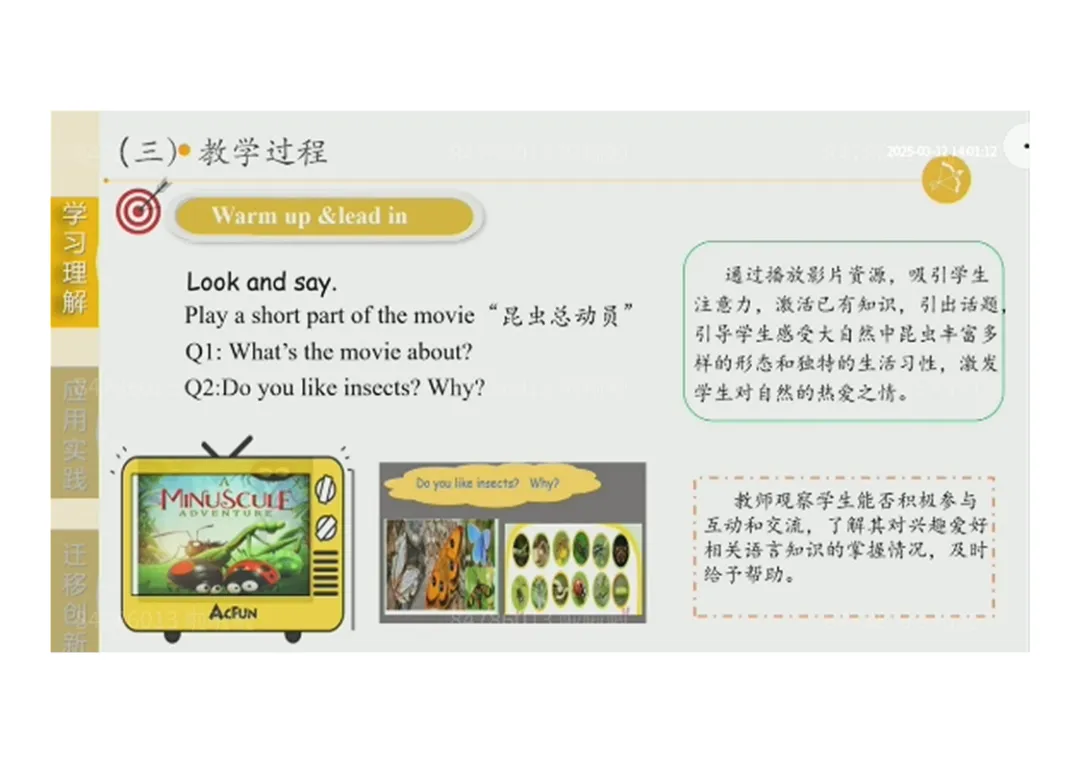 1.Warm up & lead in:播放《昆虫总动员》片段,激活兴趣,引出昆虫话题;