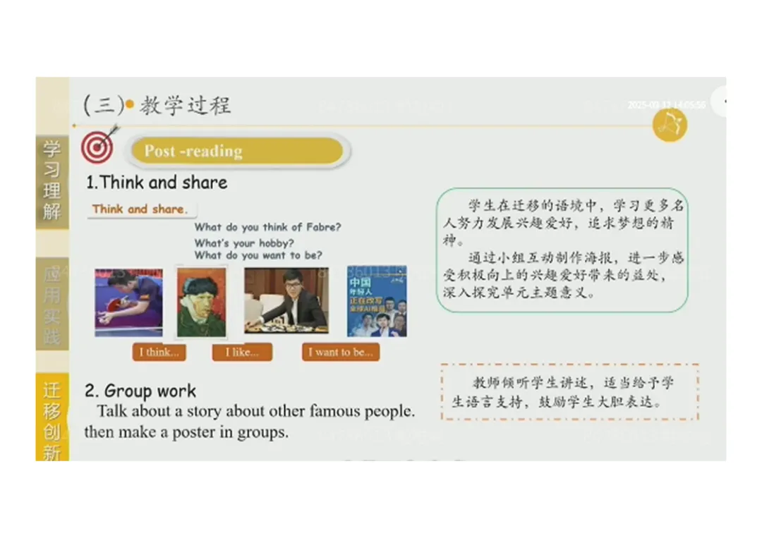 3.Post-reading:分享对法布尔的看法→小组合作制作名人爱好海报;