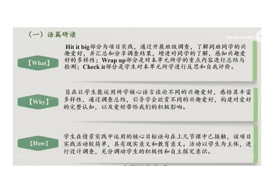 1.What:班级爱好调查实践、单元知识总结、学生自我评价、中国传统爱好拓展;