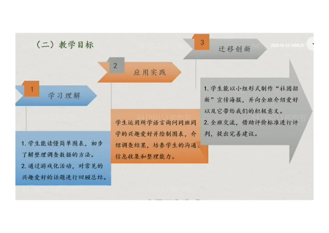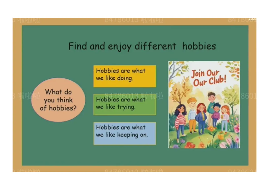 3.迁移创新:以“校园小记者” 身份,运用句型采访同学爱好,分享爱好带来的快乐。