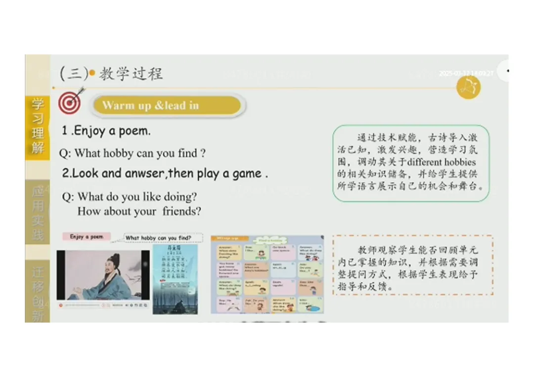 1.Warm up & lead in:欣赏诗歌回顾爱好→游戏问答,激活单元知识;