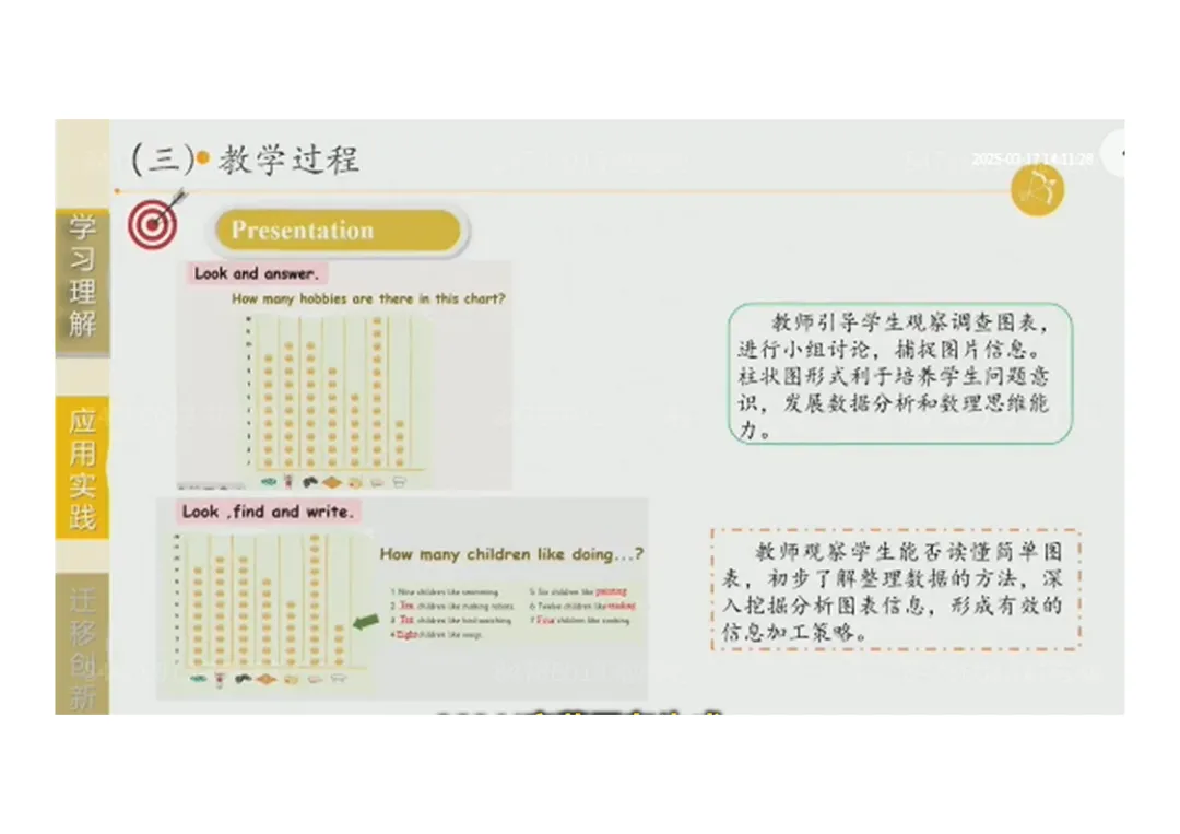 2.Presentation:思考“爱好是什么”→分析调查图表,学习数据整理方法;