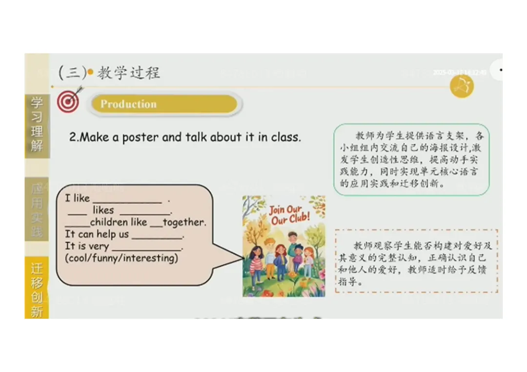 3.Production:组内循环问答收集爱好信息→制作社团海报并展示→阅读绘本,深化对爱好的认知;
