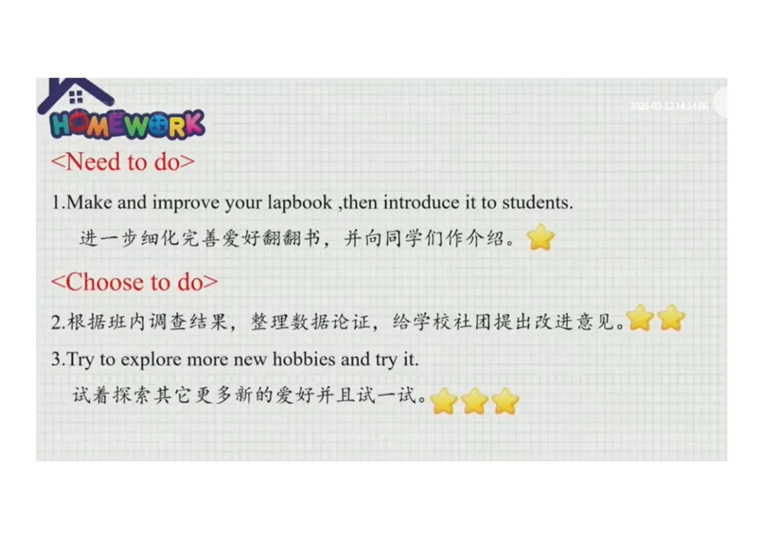 ○拓展:根据调查结果给学校社团提建议、探索新爱好。