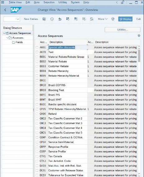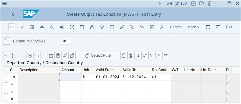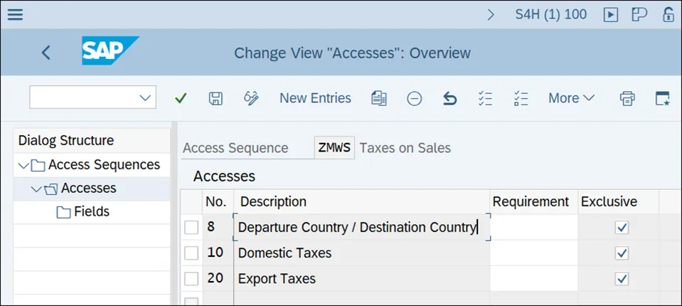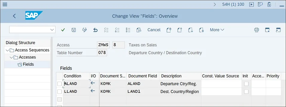 现在,让我们定义我们自己的自定义访问序列 ZMWS,它是标准 MWST 的副本,但访问不同的表。要设置此访问序列,请按照菜单路径“销售与分销”→“基本功能”→“定价”→“定价控制”→“访问序列”→“设置访问序列”操作。此表是跨客户端表,确认警告消息后,你将看到已定义的访问序列列表,如下图所示。选择 MWST,然后从顶部菜单中选择“复制为”。现在,将新的访问序列重命名为“ZMWS”,并将其描述更改为“销售税”。从屏幕左侧选择“访问”,并修改要访问的条件表,如下图所示。它们的访问顺序由第一个“访问”列中的步骤编号确定。“排他”复选框控制系统在首次成功访问找到值后是否会停止搜索记录。选择第一步,然后从屏幕左侧点击“字段”,以查看条件表访问序列所使用的字段。如下图所示,我们的访问序列使用了“起运国家(ALAND)”和“目的国家(LAND1)”字段。因此,在使用此步骤进行搜索时,系统将在货物的起运国和目的国查找匹配项。如果存在匹配项,将确定为该组合维护的税码。你可以使用事务代码 VK11 维护这些条件记录。条件记录被视为应用程序数据,你也可以通过应用程序菜单路径“后勤”→“销售与分销主数据”→“条件”→“使用条件类型选择”→“VK11 - 创建”导航到这些设置。现在,输入条件类型“MWST”,将弹出一个窗口,要求你输入要创建记录的特征组合,如下图所示。这些特征取决于条件记录的配置。选择“起运国家/目的国家”以查看下一个屏幕,在该屏幕中你将输入条件记录。如下图所示,在表头中输入货物或服务的起运国家,然后在下面的行中,你可以为每个目的国家输入多条记录。有效期从/有效期至:在这些字段中,你将指定税码的有效期。税率会不时变化,使用这些字段,你可以在税率变化时灵活添加更多条件记录。税码:该字段是税码,当条件记录中概述的标准满足时,应自动分配该税码。保存你的输入,符合这些条件标准的销售文档将自动获得分配的税码。你若喜欢,点个❤️谢先👇