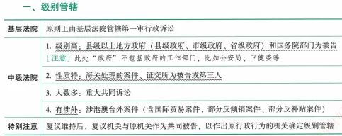 1.级别管辖:解决上下级法院之间受理行政案件的权限分工(基层、中级、高级、最高人民法院)。