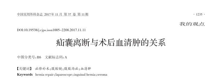 李健文,李航宇,李基业,等. 疝囊离断与术后血清肿的关系[J]. 中国实用外科杂志,2017,37(11):1235.