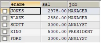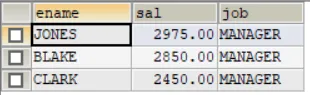 SELECT ename,sal,job FROM emp WHERE sal>2500UNION ALLSELECT ename,sal,job FROM emp WHERE job='MANAGER'