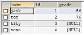 现在我们进行左外连接:select ... from 表1 left join 表2 on 条件SELECT `name`, stu.id, grade FROM stu LEFT JOIN exam ON stu.id=exam.id