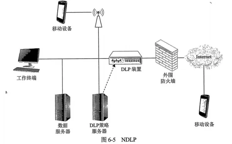 网络数据防泄露(Network DLP,NDLP)将数据保护策略用于移动状态的数据。NDLP产品通常部署在组织的网络边界,还可部署在内部子网的边界,并可作为模块部署在模块化的安全设备中。在实际中,NDLP设备的高成本导致大多数组织将其部署在流量进出点而不是整个网络中,因此NDLP设备无法检测未安装设备的网段。NDLP方案的主要缺点是无法保护不在组织网络上的设备上的数据。移动设备用户面临的风险最大,因为移动设备用户一旦离开办公场所就很容易受到攻击。3.终端数据防泄露
