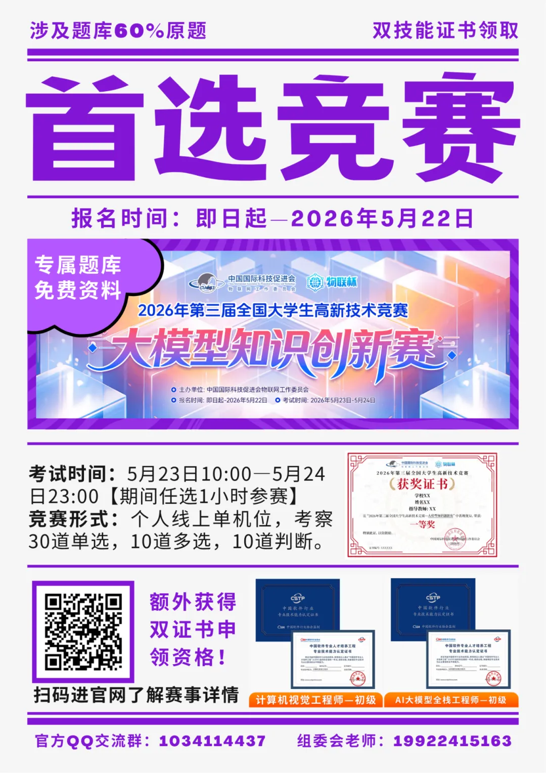 考试时间:2026年5月23日10:00——5月24日23:00【期间任选1小时参赛】预计赛后3天可查看获奖名单及下载获奖证书