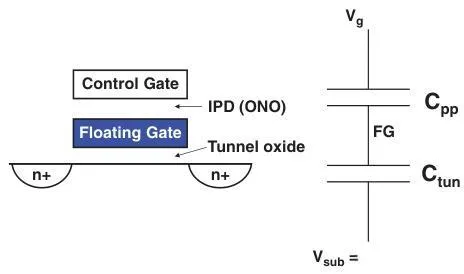 从之前Cell的示意图可以知道,FG的电势是由CG上的电压Vg来控制的。我们可以用一个简单的串联电容模型来计算FG上的电势V_tun,C_pp是CG到FG的电容,C_tun是FG到沟道的电容。那么,在写操作时,Vg耦合到V_tun,引入耦合系数K_w: