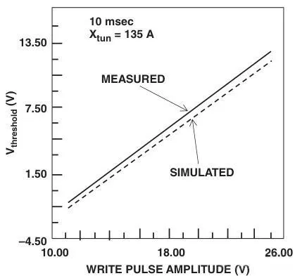 V_{tw}=V_{ti}-Q_{fg}/C_{pp}=V_{ti}+V_g\cdot (1-V'_{tun}/(K_w\cdot V_g))V_{te}=V_{ti}-Q_{fg}/C_{pp}=V_{ti}-V_{well}\cdot (K_e/K_w-V'_{tun}/(K_w\cdot V_{well}))其中写/擦后的V'tun与氧化层厚度有关,假设脉冲时间够长,FN隧穿达到平衡,则可以用最低电场10^7V/cm来近似求得。