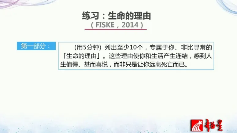 第四个方面就是意义感。我们来回答一个问题,就是生命需要理由吗?其实有些时候生命真的有时候需要理由,当你没有理由的时候,你会发现过得浑浑噩噩的,当你有了理由以后,你会发现走路的步子也会变得更加坚定了。下面呢我们来做一个关于生命理由的练习,大家用5分钟的时间呢列出至少10个专属于你非比寻常的生命的理由。