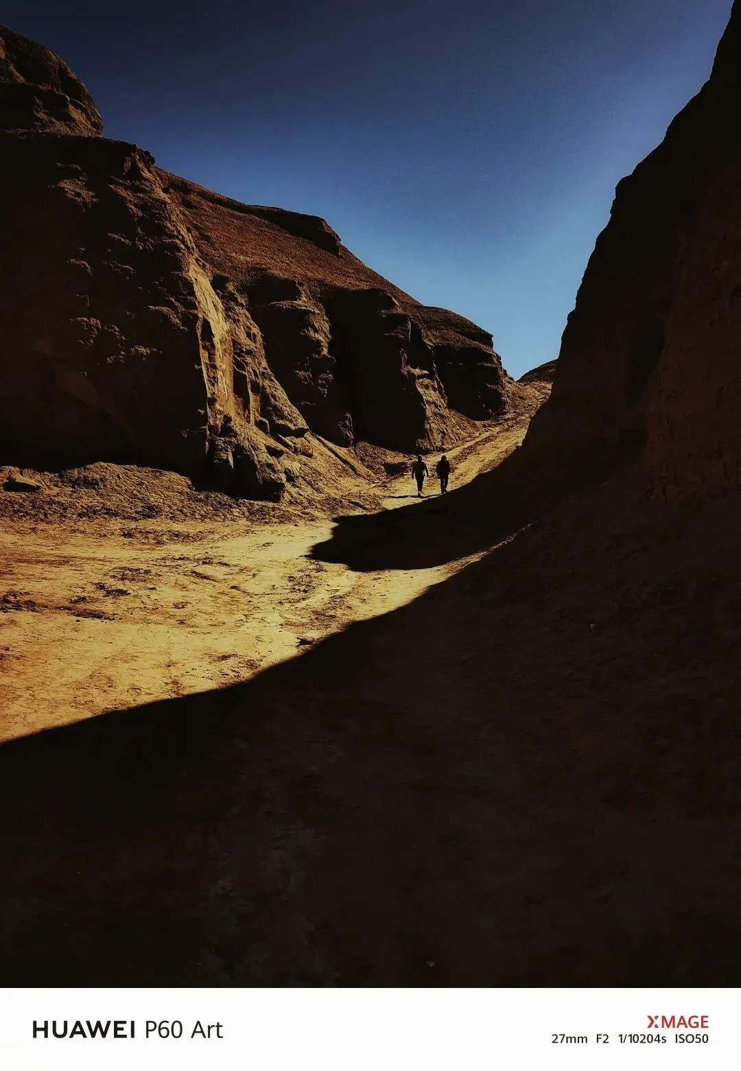 这张拍摄于魔鬼城的照片。强烈的阳光将峡谷的一侧照亮,而另一侧则完全处于深邃的阴影中,这种强烈的明暗对比,不仅突出了峡谷岩壁的质感和线条,也让行走在光影交界处的人影更加突出,充满了故事感。