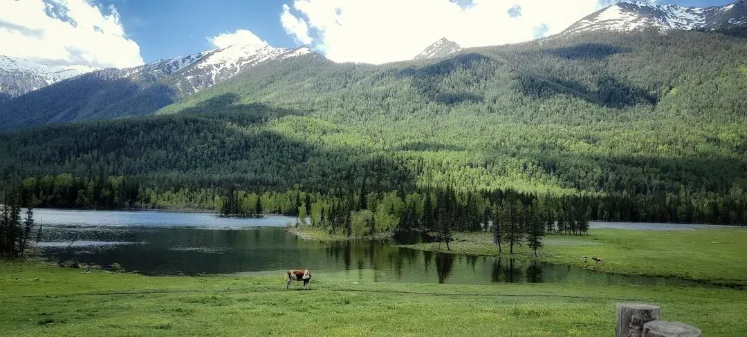 这张图中,我们没有把吃草的牛放在画面正中央,而是将它放在了画面下方偏左的位置,这样不仅符合视觉习惯,也为右侧的湖水和森林留出了空间,让整个画面显得更加舒展、自然。