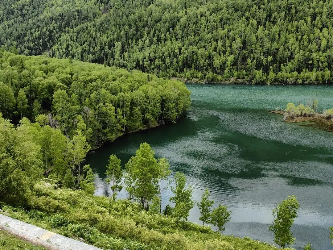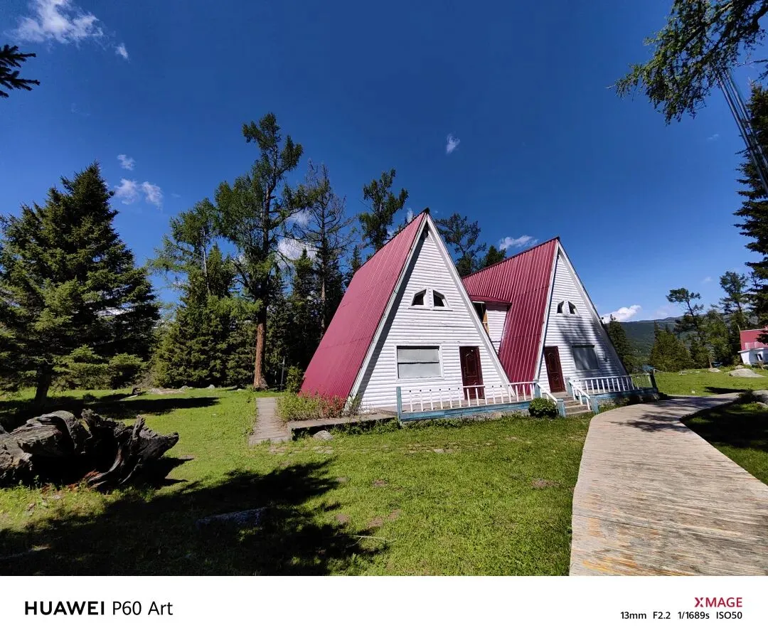 这张喀纳斯的木屋,主体建筑的艳红屋顶与纯白墙体构成核心撞色,在蓝天、绿树构成的冷色环境衬托下,瞬间成为视觉焦点;左下角深褐枯木与暖棕栈道的大地色系,中和了红绿蓝的跳跃感,让对比鲜明的色彩既吸睛又平衡。