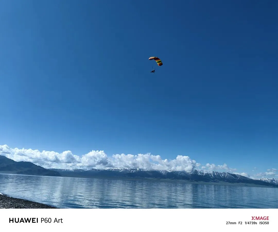 而这张图中,静止的赛里木湖和空中滑翔的伞翼形成了动静对比,让画面充满了动感和自由的气息。