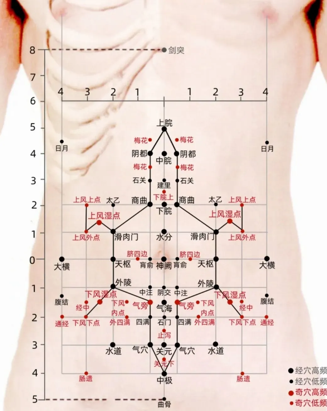 腹四关:两侧滑肉门(上段及上腹部问题)、两侧外陵(下段及下腹部问题)。