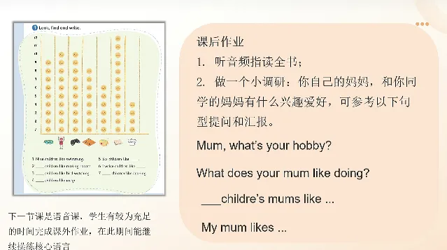 小tip:为了让学生都能参与,都张嘴说,简单问题可以让学生进行pair work 一问一答进行对话;让全班站起来说,说完的小组自己坐下,便于老师及时知道完成情况。