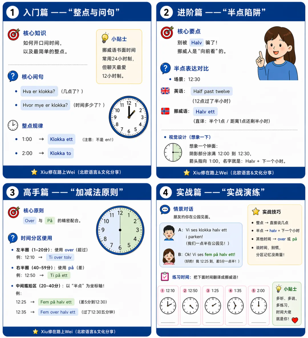 挪威语的分钟表达非常有画面感,它以整点和半点为坐标系来描述时间: