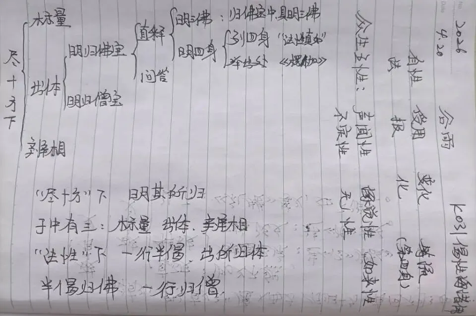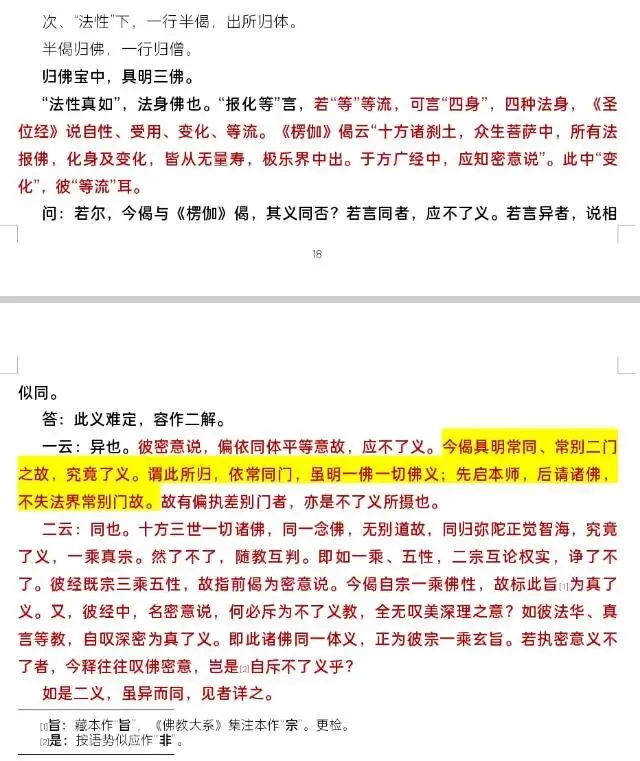 《楷定记》原文K031 次、“法性”下,一行半偈,出所归体。半偈归佛,一行归僧。归佛宝中,具明三佛。“法性真如”,法身佛也。“报化等”言,若“等”等流,可言“四身”,四种法身,《圣位经》说自性、受用、变化、等流。《楞伽》偈云“十方诸刹土,众生菩萨中,所有法报佛,化身及变化,皆从无量寿,极乐界中出。于方广经中,应知密意说”。此中“变化”,彼“等流”耳。问:若尔,今偈与《楞伽》偈,其义同否?若言同者,应不了义。若言异者,说相似同。答:此义难定,容作二解。一云:异也。彼密意说,偏依同体平等意故,应不了义。今偈具明常同、常别二门之故,究竟了义。谓此所归,依常同门,虽明一佛一切佛义;先启本师,后请诸佛,不失法界常别门故。故有偏执差别门者,亦是不了义所摄也。二云:同也。十方三世一切诸佛,同一念佛,无别道故,同归弥陀正觉智海,究竟了义,一乘真宗。然了不了,随教互判。即如一乘、五性,二宗互论权实,诤了不了。彼经既宗三乘五性,故指前偈为密意说。今偈自宗一乘佛性,故标此旨[1]为真了义。又,彼经中,名密意说,何必斥为不了义教,全无叹美深理之意?如彼法华、真言等教,自叹深密为真了义。即此诸佛同一体义,正为彼宗一乘玄旨。若执密意义不了者,今释往往叹佛密意,岂是[2]自斥不了义乎?如是二义,虽异而同,见者详之。 提问31讲:记文中讨论“了义”和“不了义”,对我们弘扬念佛有什么启发? 回答31讲提问:《楷定记》中引《解深密经》云: 有教、空教,为不了教,名为诤论安足处所。诸中道教,为了义教,名非诤论安足处所。是故所有讲说,偏于一边为不了义,争论丛生;中道讲者,为了义,不会引起争论。
