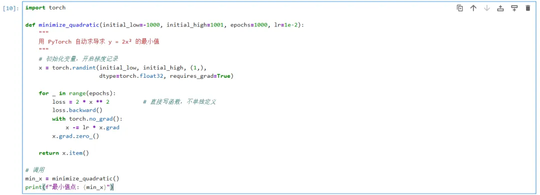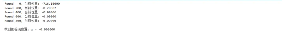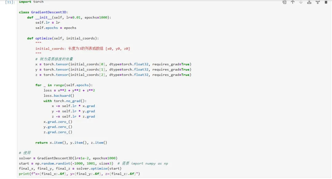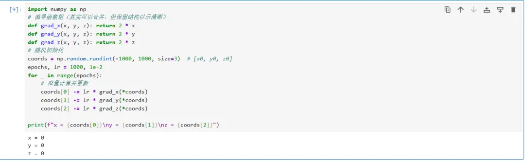 import numpy as np# 偏导函数组(其实可以合并,但保留结构以示清晰)def grad_x(x, y, z): return 2 * xdef grad_y(x, y, z): return 2 * ydef grad_z(x, y, z): return 2 * z# 随机初始化coords = np.random.randint(-1000, 1000, size=3) # [x0, y0, z0]epochs, lr = 1000, 1e-2for _ in range(epochs): # 批量计算并更新 coords[0] -= lr * grad_x(*coords) coords[1] -= lr * grad_y(*coords) coords[2] -= lr * grad_z(*coords)print(f"x = {coords[0]}\ny = {coords[1]}\nz = {coords[2]}")